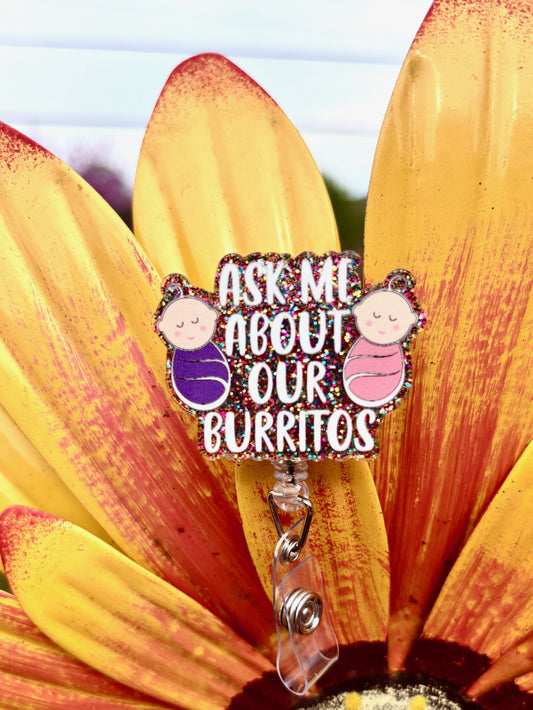 "Ask about our burritos" Badge Reel with Alligator clip
