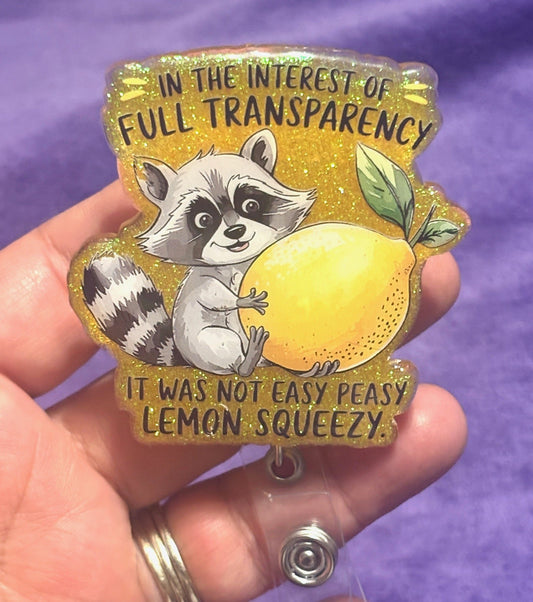 Racoon with a Lemon Badge Reel with an Alligator Clip