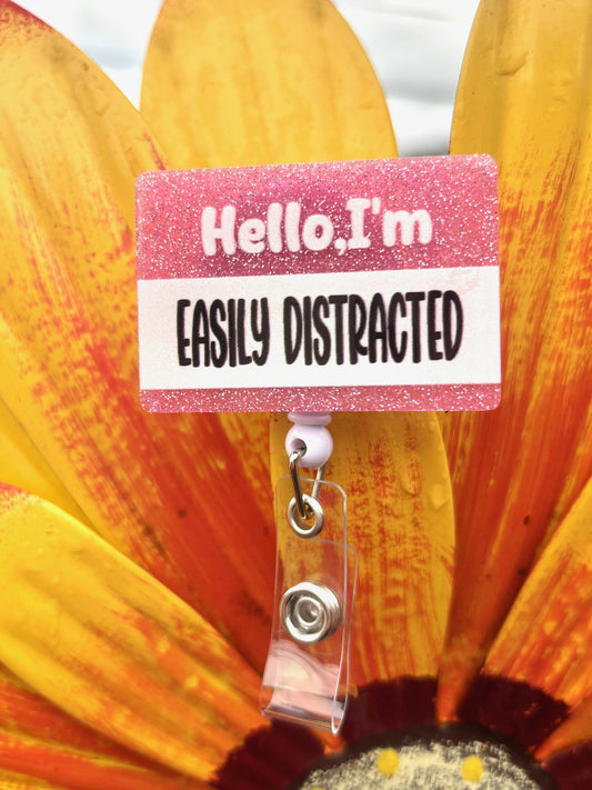 "Hello, I'm easily distracted" Badge Reel with Alligator clip