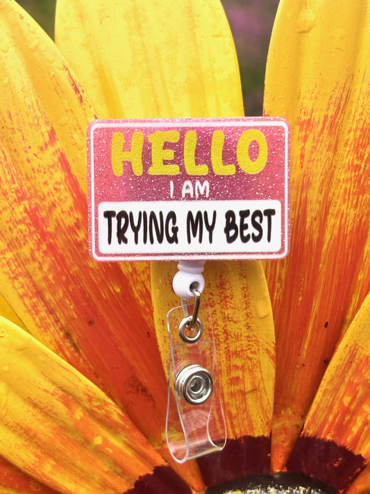 "Hello, I am trying my best" Badge Reel with Alligator clip