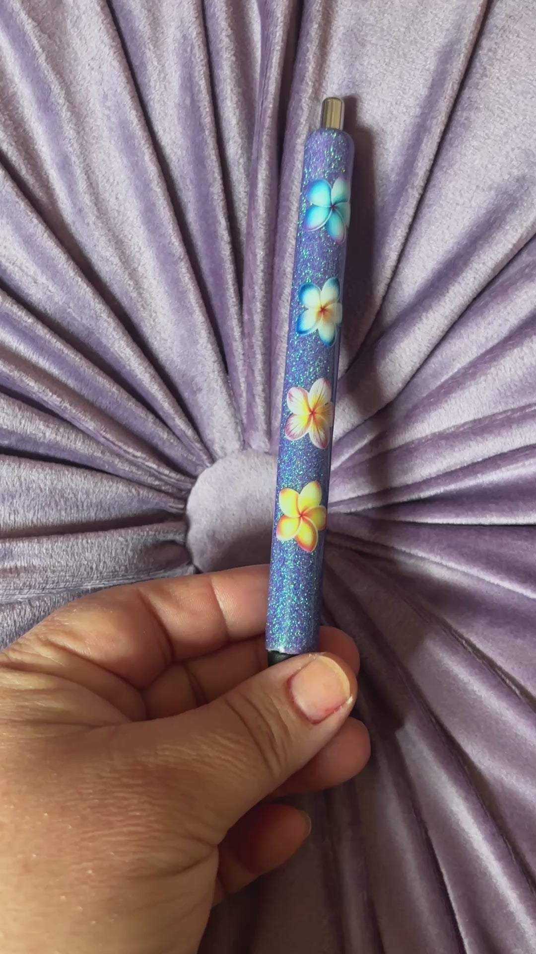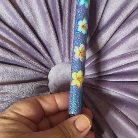 Write with this stunning black gel pen. It's adorned with delicate plumeria flowers suspended in crystal-clear resin. The hard resin coating protects the tropical design while keeping your pen looking fresh and fabulous. A little piece of paradise in pen form!